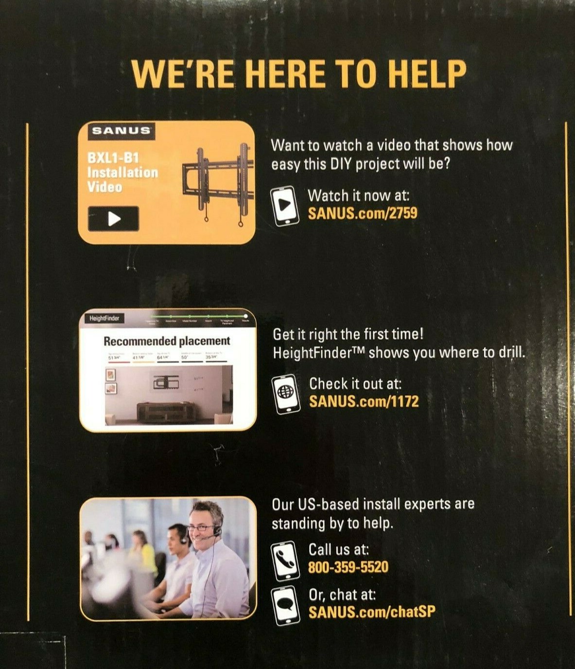 The bracket doesnt cover up anything on the back of the TV that it shouldnt. SANUS BXL1 fixed-position mount is perfect for viewing your TV at eye level. Super slim low-profile mount 2 pages TV Mount Sanus VXF730-B2 Instruction Manual.